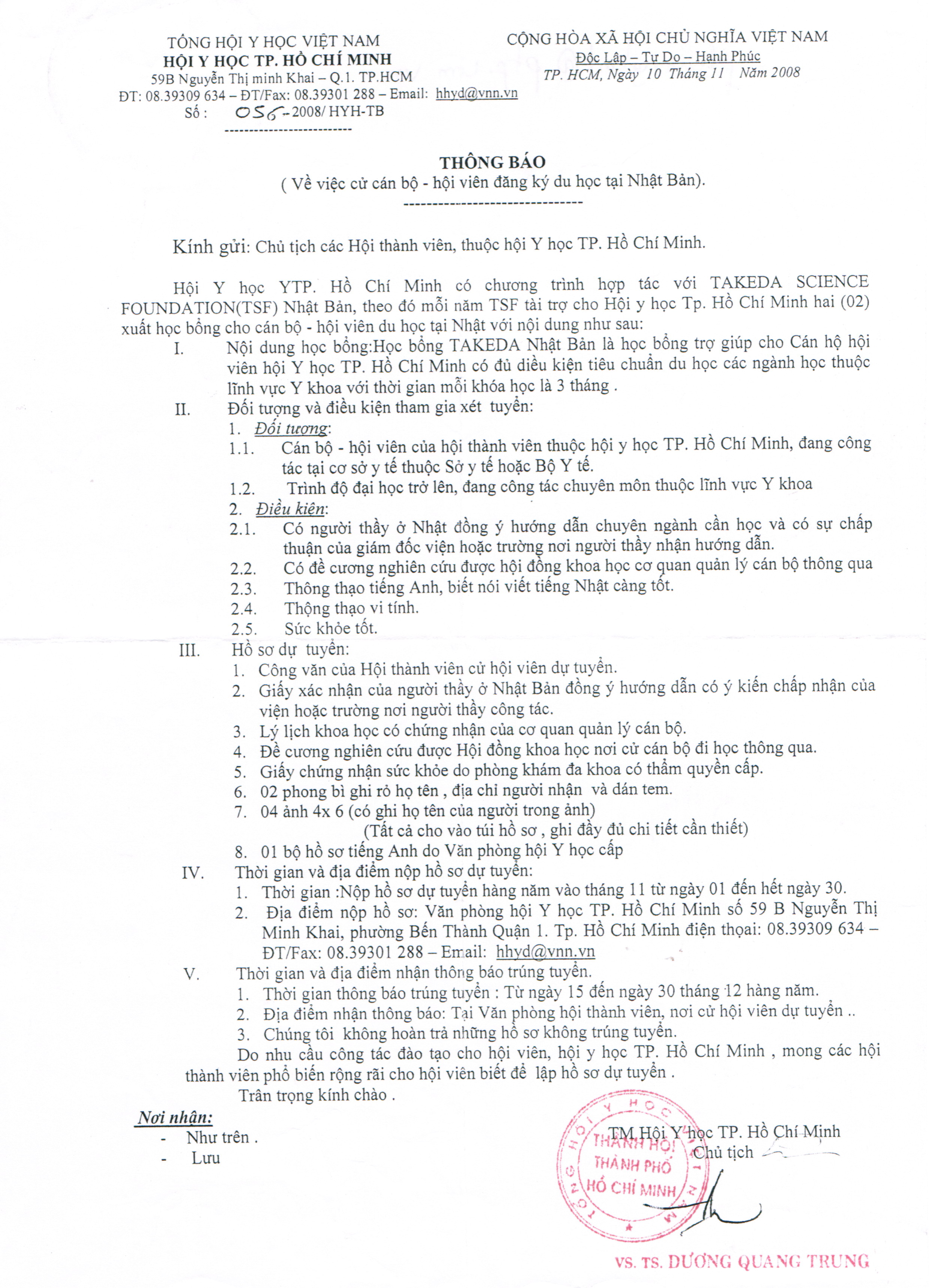 | Liên hệ: | Thông báo của hội Y học TpHCM về việc cử cán bộ, hội viên đi du học tại Nhật Bản |