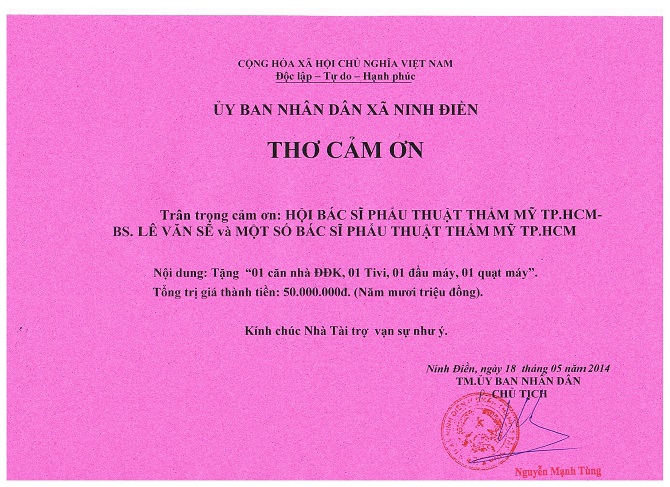 Ngày 18/5/2014, Đại diện Ban Chấp Hành Hội Phẫu Thuật Thẩm Mỹ TP.HCM, Ban Từ Thiện của Hội, gồm BS Lê Văn Sẽ, BS Hồ Hoài Nam, ThS BS Nguyễn Thanh Hải, ThS.KH Phan Minh Nhựt đã phối hợp cùng UBND xã Ninh Điền, huyện Bàu Tràm, tỉnh Tây Ninh tổ chức Lễ Bàn Giao Nhà Đại Đoàn Kết từ thiện do Hội PTTM TP.HCM tài trợ cho hộ ông Lê Văn Táng (sinh năm 1933). Được biết ông Lê Văn Táng là một cựu chiến binh có hoàn cảnh đặc biệt khó khăn tại xã. Dù tuổi đã cao nhưng ông vẫn hàng ngày đi chăn bò thuê kiếm sống. Do con đông, lại không có đất đai canh tác, nên nhiều năm qua hai ông bà chỉ sống trong một căn nhà lá rách nát tạm bợ.