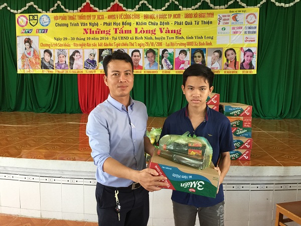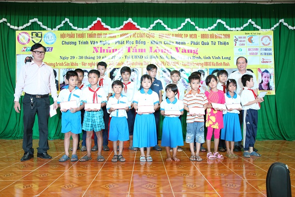 Ngày 29 và 30/10/2016 vừa qua, Hội Phẫu Thuật Thẩm Mỹ TP.HCM đã kết hợp Khoa Y Tế Công Cộng – Đại Học Y Dược TP.HCM tổ chức thành công Chương Trình Văn Nghệ, Khám Chữa Bệnh, Phát Thuốc, Phát Quà từ thiện cho 250 hộ nghèo, trao 20 suất Học Bổng, 33 bộ đồng phục thể dục, 32 thẻ Bảo Hiểm Y Tế, 75 phần quà cho các em học sinh nghèo Cấp 1, Cấp 2 của xã Bình Ninh, Huyện Tam Bình, Vĩnh Long. Tổng kinh phí gần 200 triệu đồng.